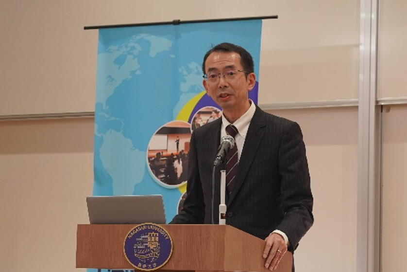 これに続き、永安学長が共催者を代表して挨拶し、被爆80年という節目の年に、「『核兵器のない世界』に向けた日本外交の取組」をテーマとした貴重な対話の場が本学で開催されることの意義に触れるとともに、国際社会が直面する課題を自らの問題として考えることの重要性について述べました。
