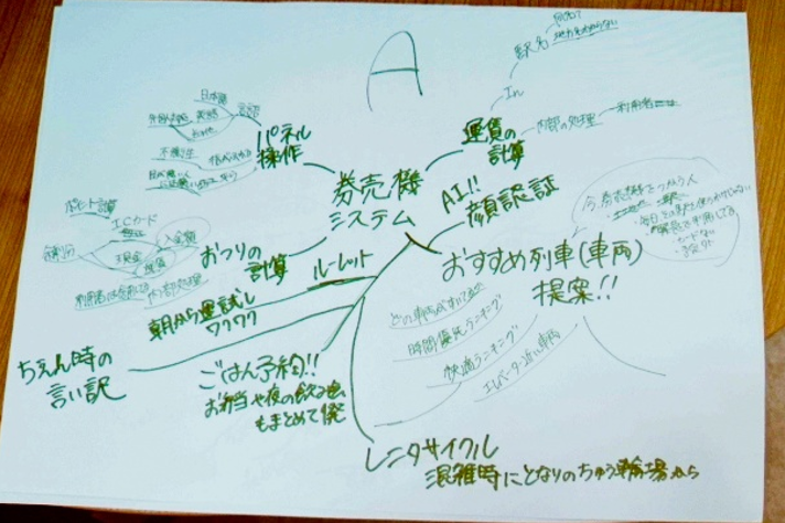 続いて、高木氏がシステム開発の工程を紹介し、各工程でエンジニアに求められる思考について解説。その後、「駅の券売機に求められる機能」をテーマに、マインドマップを用いたアイデア整理を実施。グループ発表では、既存機能の改善提案に加え、次のような新しいアイデアが出されました。