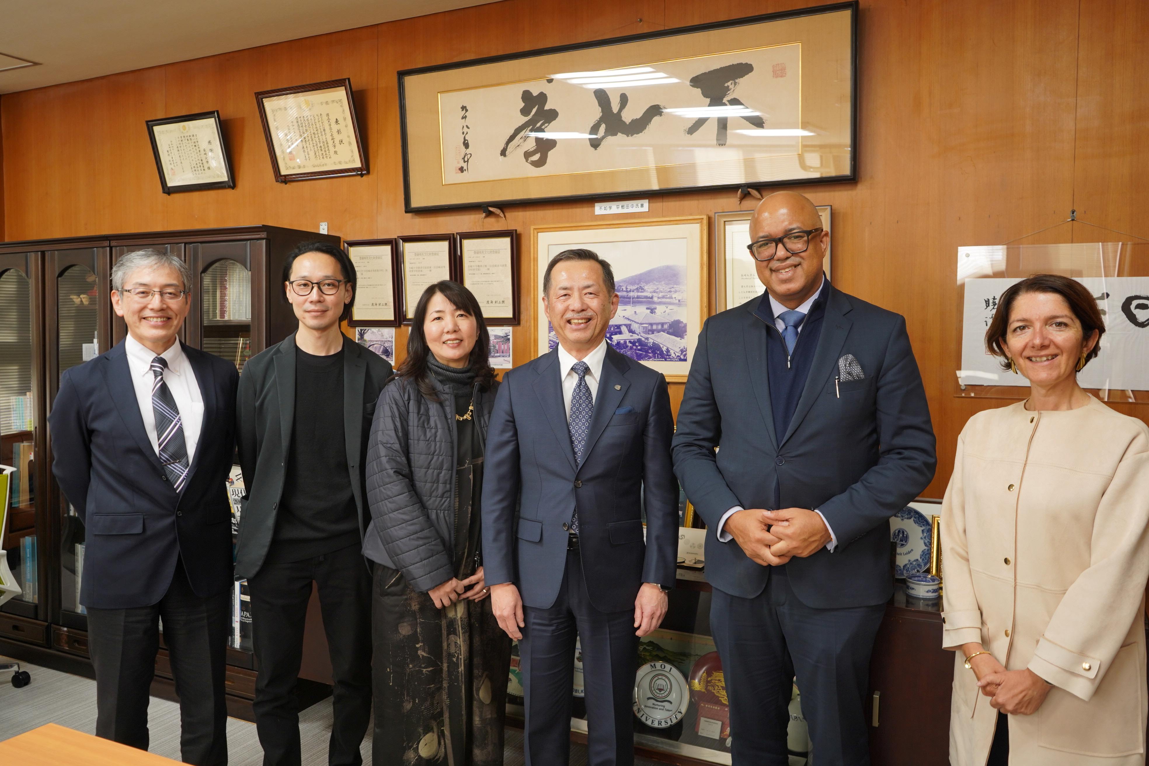 本学では、永安学長をはじめ、安武理事(学生・国際担当)、同学術総会の会長を務める金子聰 教授(熱帯医学研究所)、同研究所の客員研究員である東京大学新世代感染症センターの古瀬祐気教授が参加し、イヘクウェアズ博士をお迎えしました。
