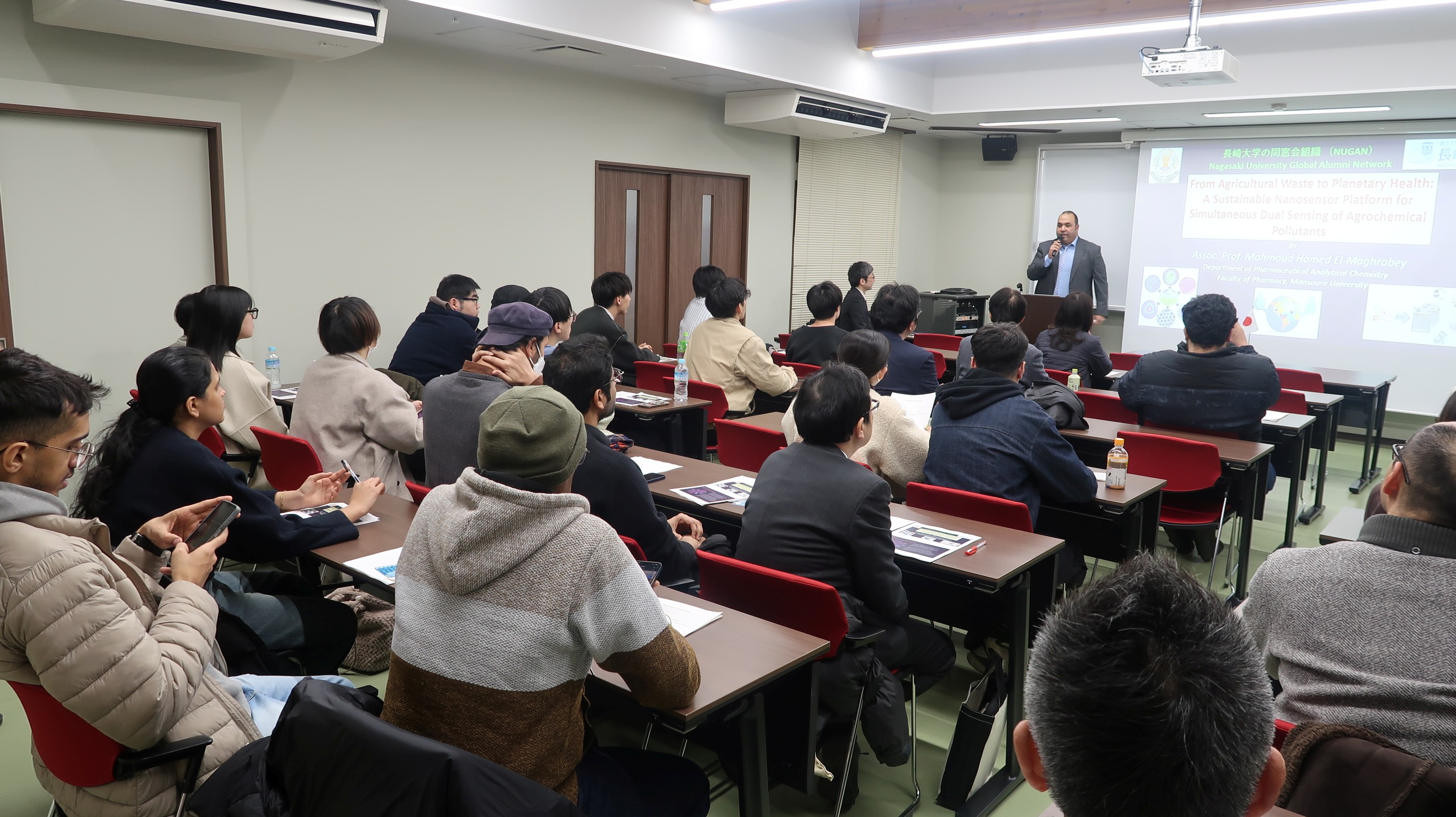 2026年1月29日(木)、本学文教キャンパスの葉国璽交流会館にて、本学博士課程修了生であるMahmoud Hamed El-Maghrabey准教授(エジプト・マンスーラ大学)を講演者に迎え、国際セミナー「農業廃棄物からプラネタリーヘルスへ ―農薬・重金属を同時検出する持続可能ナノセンサー―」を開催しました。