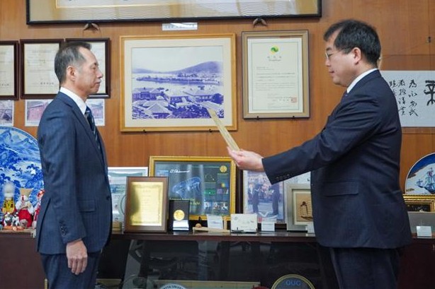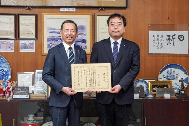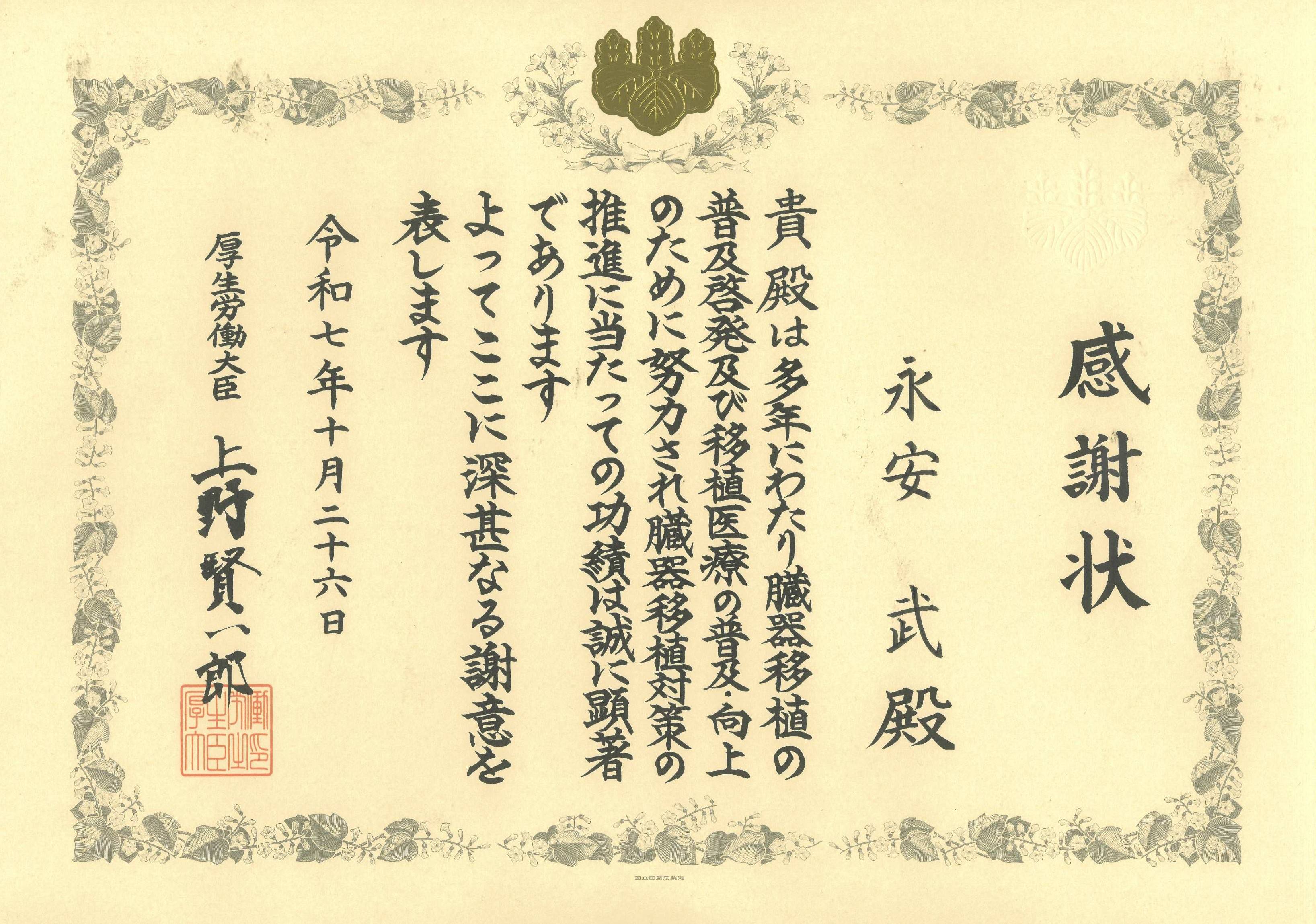 本学の永安武 学長は、臓器移植対策の推進に関する長年の取り組みと功績が評価され、令和8年2月4日、長崎県福祉保健部および関係機関の出席のもと、本学学長室で開かれた伝達式において「臓器移植対策推進功労者」として厚生労働大臣感謝状が贈呈されました。