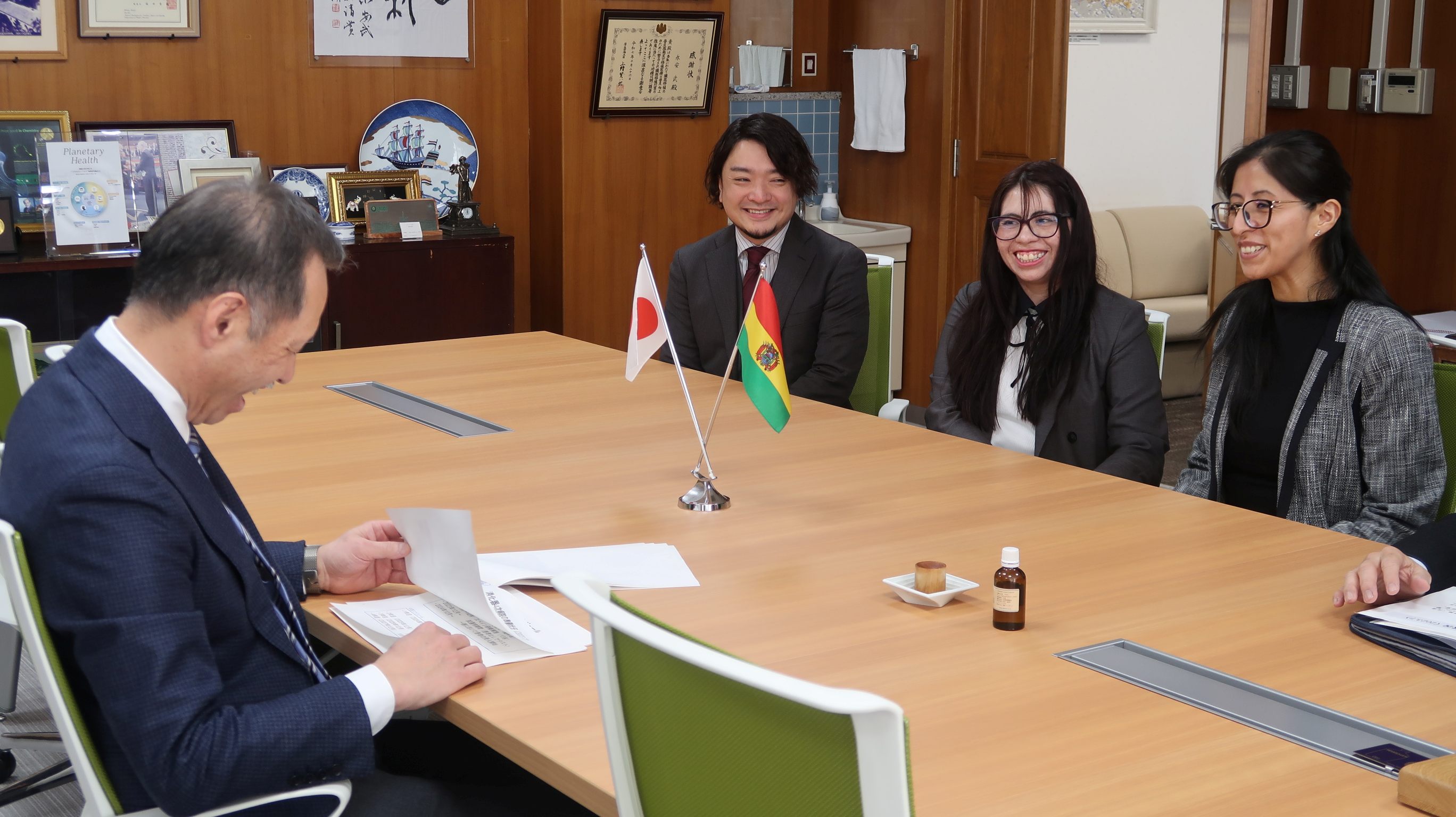 訪問では、学長から研修成果を母国の医療発展に活かしてほしい旨の激励があり、両医師は本学での学びへの感謝を述べました。今後、ボリビアの四次病院(専門に特化した、国内でも最大規模の病院)での消化器医療の発展に貢献することが期待されます。