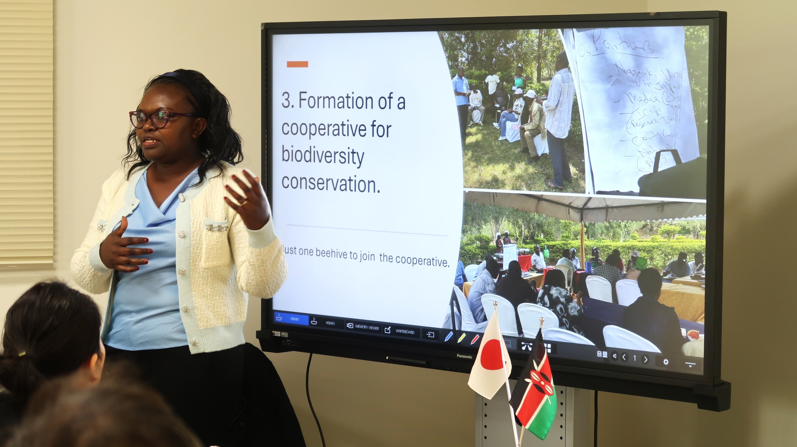 セミナーでは、気候変動の影響を強く受けるケニア・キトゥイ郡において、地域住民が協同組合を設立し、養蜂を軸とした持続可能な地域づくりを進めている実践が紹介されました。養蜂が、はちみつ生産にとどまらず、生物多様性の保全、森林伐採の抑制、住民の収入向上、健康改善など、幅広い分野に貢献する「Nature-based Solutions」として機能する可能性が、豊富な現地データや写真とともに解説されました。