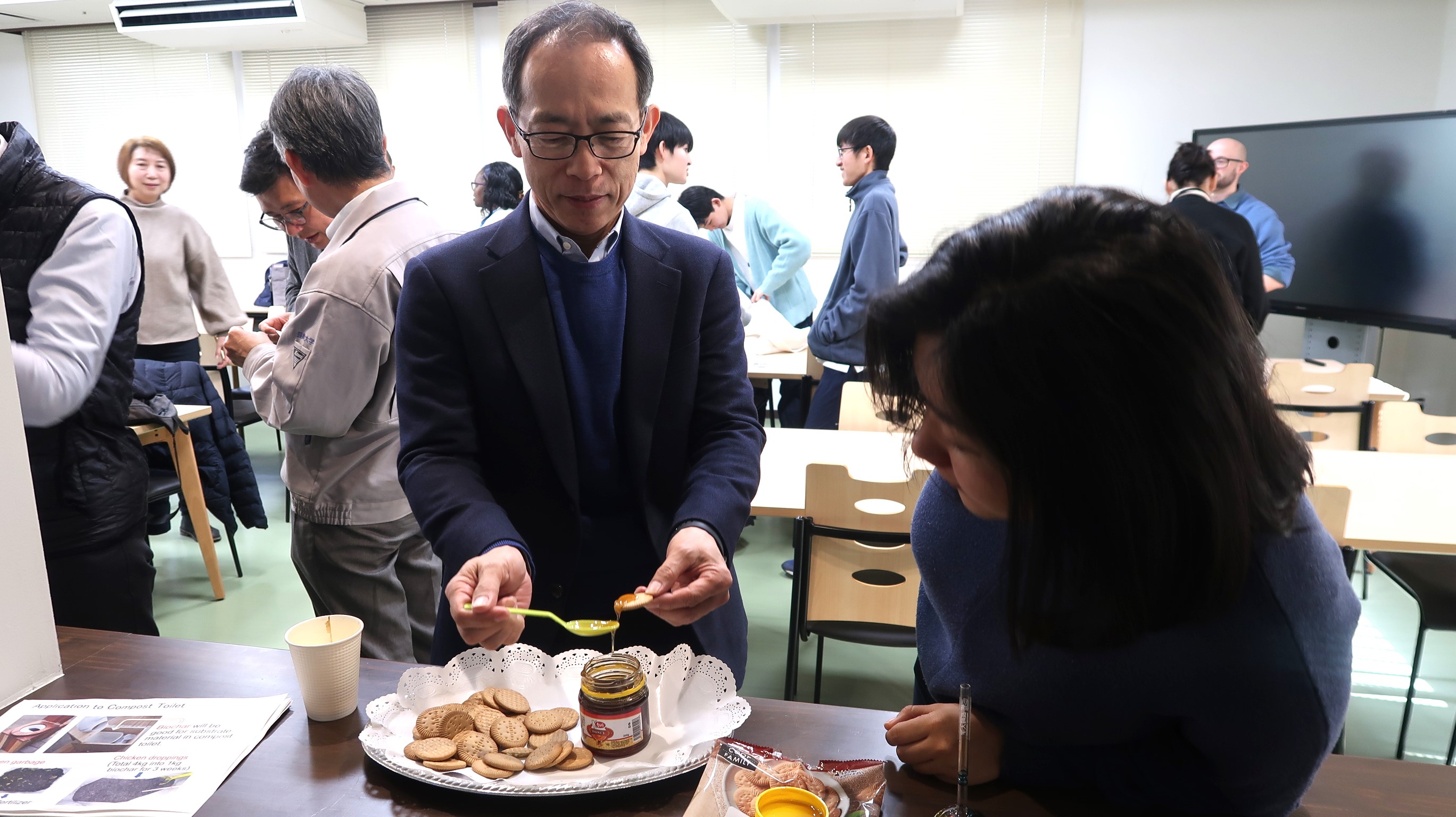 交流会は、ケニア産はちみつの試食と軽食を楽しみながら、幅広い専門領域から参加した教職員・学生が国際的なつながりを広げる場ともなりました。