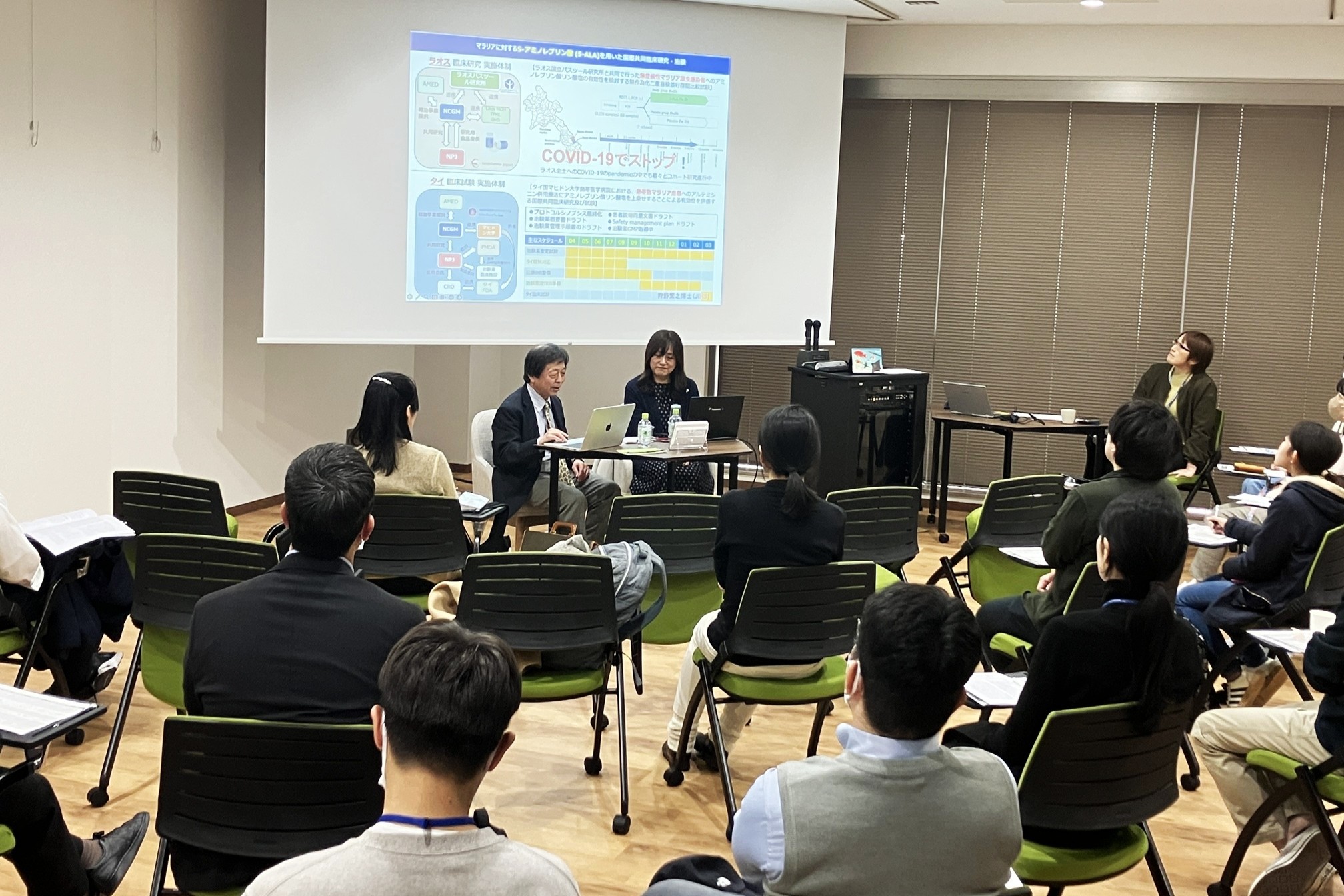 2026年3月5日(木)、長崎大学坂本キャンパス統合感染症研究棟2階交流スペースにて、「国際共同研究入門カフェ」を開催しました。本イベントは、本学の研究者・学生が国際共同研究の第一歩を踏み出すための動機付けを目的として企画され、豊富な国際共同研究経験を持つ2名の教員が登壇しました。様々な学部から教職員、学生約30名が参加し、座談会と懇親会を通じて交流を深めました。