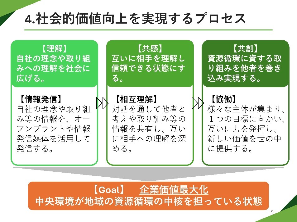 学生たちの提案は、社会的価値を高める重要性にはじまり、そのプロセス、その中で実現すべき取り組みに至るものでした。特に、社会との関係性を構築する「理解」から「共感」へ、「共感」から「共創」へという段階のなかでも、資源循環産業として「理解」や「共感」を得る努力を惜しむべきではないことが強調されました。そして、具体的な取り組みとして、対象、内容や行程も示しながら、オープンプラントを提案しました。オープンプラントとは、搬入された廃棄物=資源の分別、中間処理、リサイクルや最終処分に至る工程について、従業員の家族、地域住民や広く社会に開き、現場で見て、聞いて、感じてもらうことで理解を促そうとする取り組みです。そして、その意義を、「自社への理解や共感の醸成」、「自社の業務プロセスの改善」と「従業員のやりがい」に整理して伝えました。