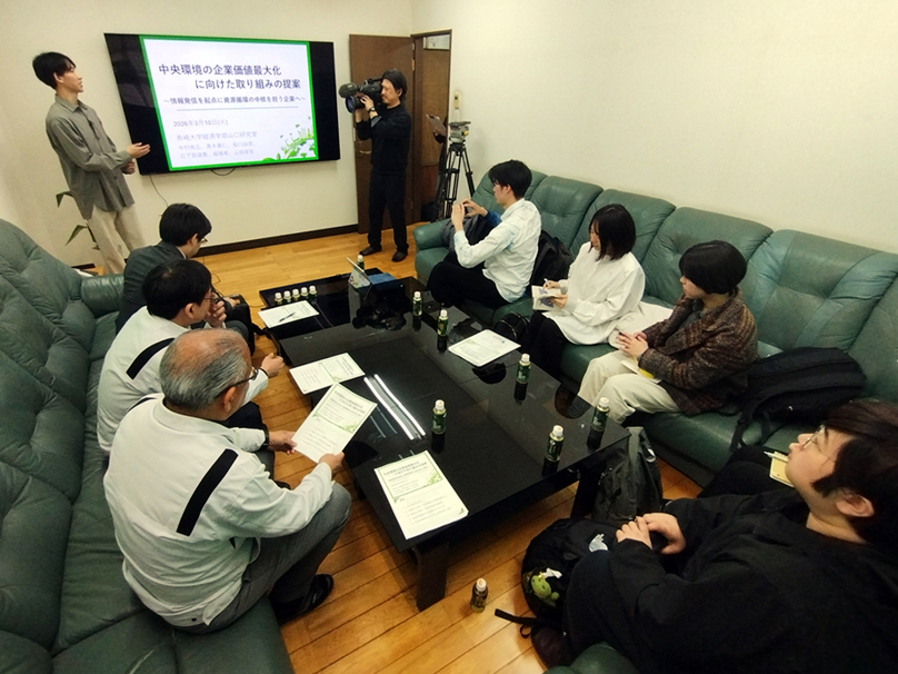 他方、必ずしも認証制度等ではカバーできない企業価値の向上に向けた取り組みがあります。特に、企業価値を構成する「市場価値」と信頼や共感など目に見えない「社会的価値」において後者を高める取り組みは、経営課題の中でも後回しにされがちです。しかし、社会的価値の追求が、結果として市場価値の実現につながる例が散見されるようになってきています。そこで、地域経済を学ぶ学生が、中央環境の事業所や商工中金による同社へのコンサルティングの現場を見学(2026年1月15日(木)・27日(火))するとともに、先行研究・事例も調査して社会的価値の増大に資する取り組みを提案しました。