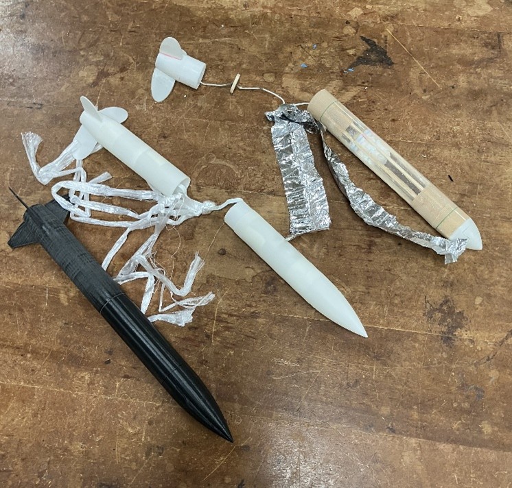 右上:今回のコンテストのために製作した機体3Dプリンター、バルサ材、クリアファイルで製作 他の2つ:3Dプリンターのみで製作した機体 |