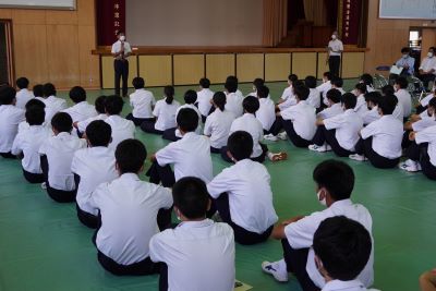 後日、研究成果はポスターにまとめ、9月21日、長崎北陽台高校体育館での対面およびZoomによるオンラインのハイブリッド形式で研修発表会を実施しました。対面での研修発表会には萩原水産学部長、菅教授および八木准教授が、オンラインでは他の教員と大学生が、それぞれ参加し、高校生らに質問やアドバイスを行いました。