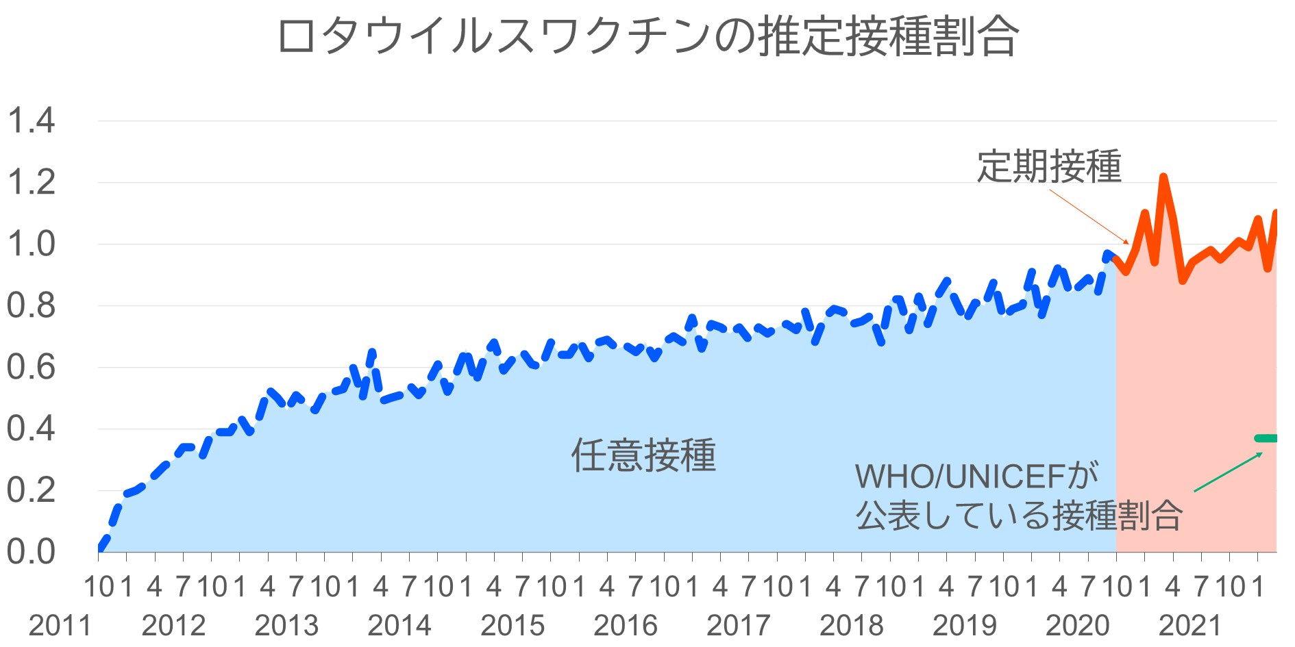 ロタウイルスワクチンの推定接種割合は、2011年10月の接種開始後から上昇傾向を示し、2021年1月時点で0.9に達し、その後横ばいでした(図1)。