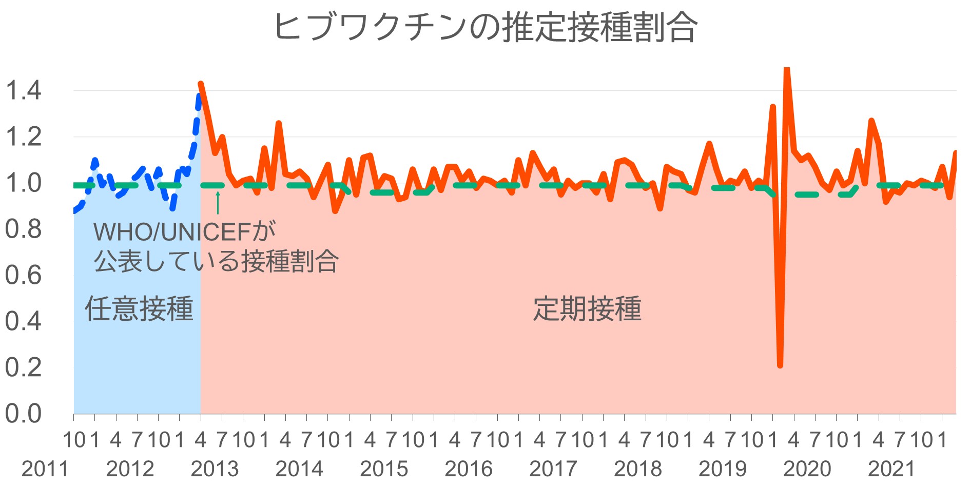 ヒブワクチンの推定接種割合は、2011年末の時点で既に1.0に達しており、定期接種化(2013年4月)のタイミングで一時的な上昇を認め、その後は1.0前後で横ばいでした(図2)。