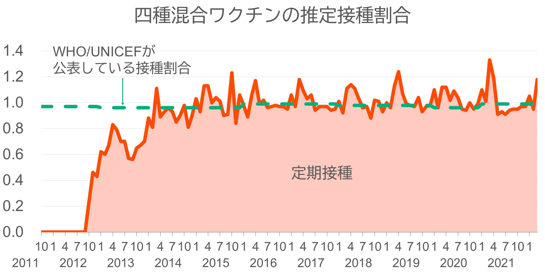 四種混合ワクチンの推定接種割合は、2012年11月の接種開始後、2013年時点で約0.6-0.7でした(図3)。その後2014年に1.0に達し、横ばいで推移しました。