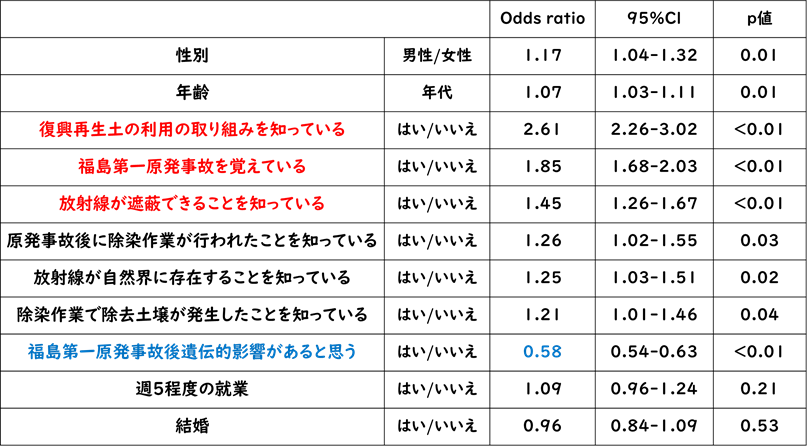 復興再生土の利用の受容に独立して影響を及ぼす要因 ロジスティック回帰分析 Odds ratio; オッズ比, CI; 信頼区間 |