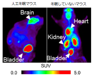図1)人工冬眠マウスでは、[18F]FDG の集積パターンが大きく異なっている。 |