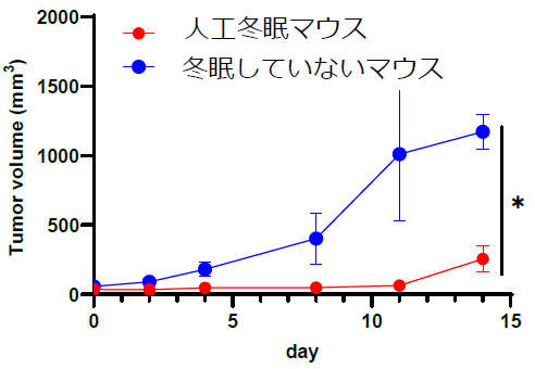 図2)人工冬眠マウスでは、皮下移植したがんの増殖が有意に低減した。平均±標準偏差(n=4-5)。 |