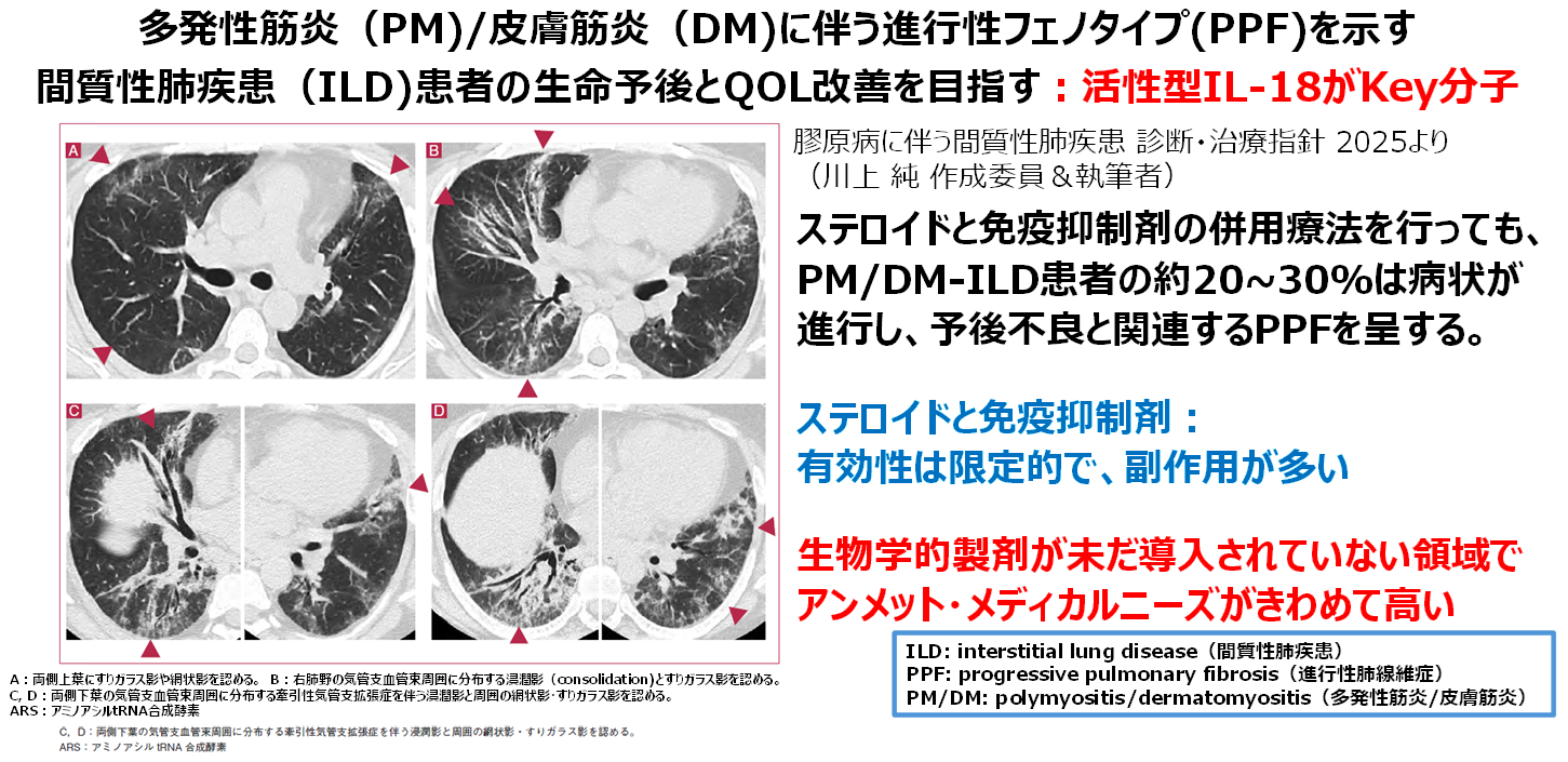 川上純教授はこれまで、難治性の自己免疫性疾患・炎症性疾患の臨床と基礎を横断した研究を一貫して進めてきました。その中でも『進行性間質性肺疾患(進行性肺線維症)』は、年余にわたり進行し、生命予後が悪く、治療選択肢も限られることから、新規治療薬の開発が強く求められている領域です(図1)。