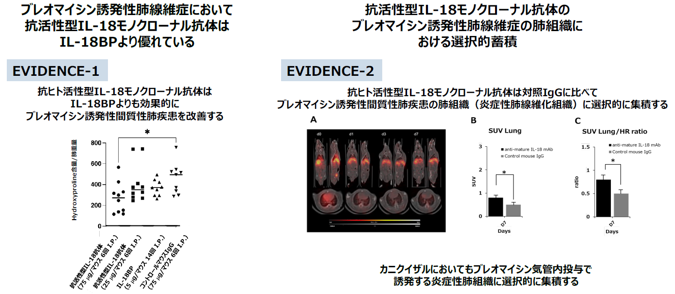 同研究グループは、2024年より国立研究開発法人日本医療研究開発機構(AMED)の「難治性疾患実用化事業」において、進行性肺線維症のキー分子と考えられる炎症性サイトカイン「活性型IL-18」を特異的に認識し、中和する「抗活性型IL-18ヒト化モノクローナル抗体」の前臨床試験を推進してきました(図2)。その結果、本抗体がマウス(ハツカネズミ)モデルおよびサル(カニクイザル)モデルにおいて、肺線維化の進行を抑制する効果を示すことを確認し、ヒトへの応用に向けた確かな科学的基盤が構築されました(図3)。そこで同研究グループは、国の指定難病「皮膚筋炎/多発性筋炎」に伴う『進行性間質性肺疾患(進行性肺線維症)』を第一の対象疾患として、「抗活性型IL-18ヒト化モノクローナル抗体」の臨床応用に向けての研究を進めています。今回の採択により、本プロジェクトでは前臨床段階で得られた知見を踏まえ、ヒトへの応用に不可欠な製剤化開発に本格的に着手します。